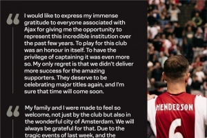 亨德森告别信:为阿贾克斯效力是我的荣幸,遗憾未带来更多成功