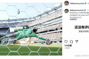 库尔图瓦社媒晒出扑救的照片,配文:“取胜并晋级半决赛!最后时刻有点棘手,但…😜🧤Hala Madrid”